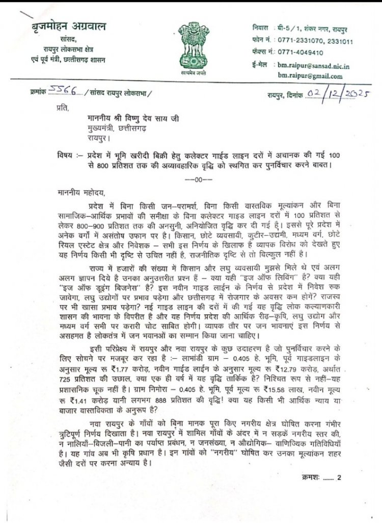 कलेक्टर गाइडलाइन की अव्यावहारिक वृद्धि पर सांसद बृजमोहन का प्रहार, मुख्यमंत्री को पत्र लिखकर तत्काल स्थगन की मांग