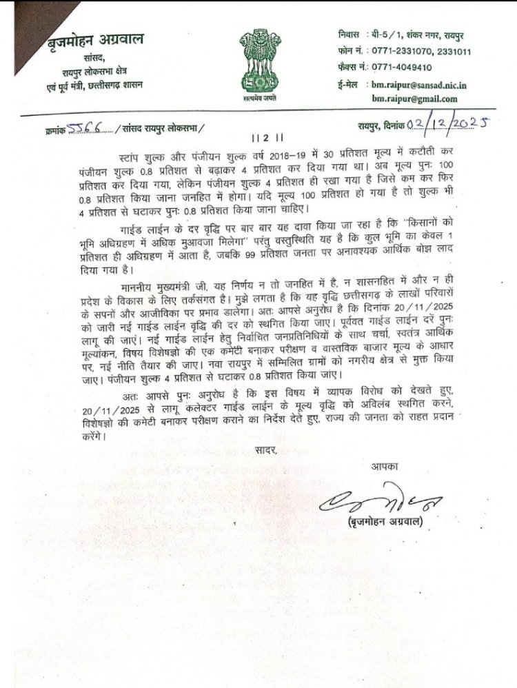 जनता पर आर्थिक बोझ नहीं होने देंगे: सांसद बृजमोहन का गाइडलाइन दरों में 100–800% वृद्धि के खिलाफ CM को पत्र